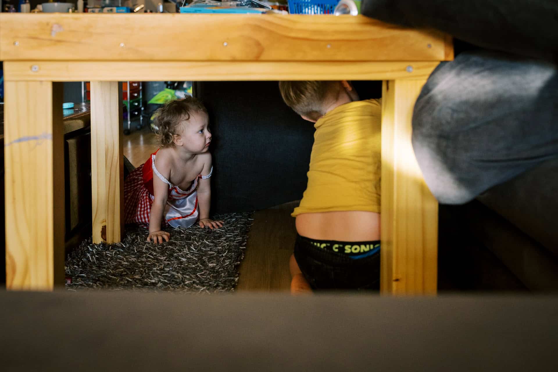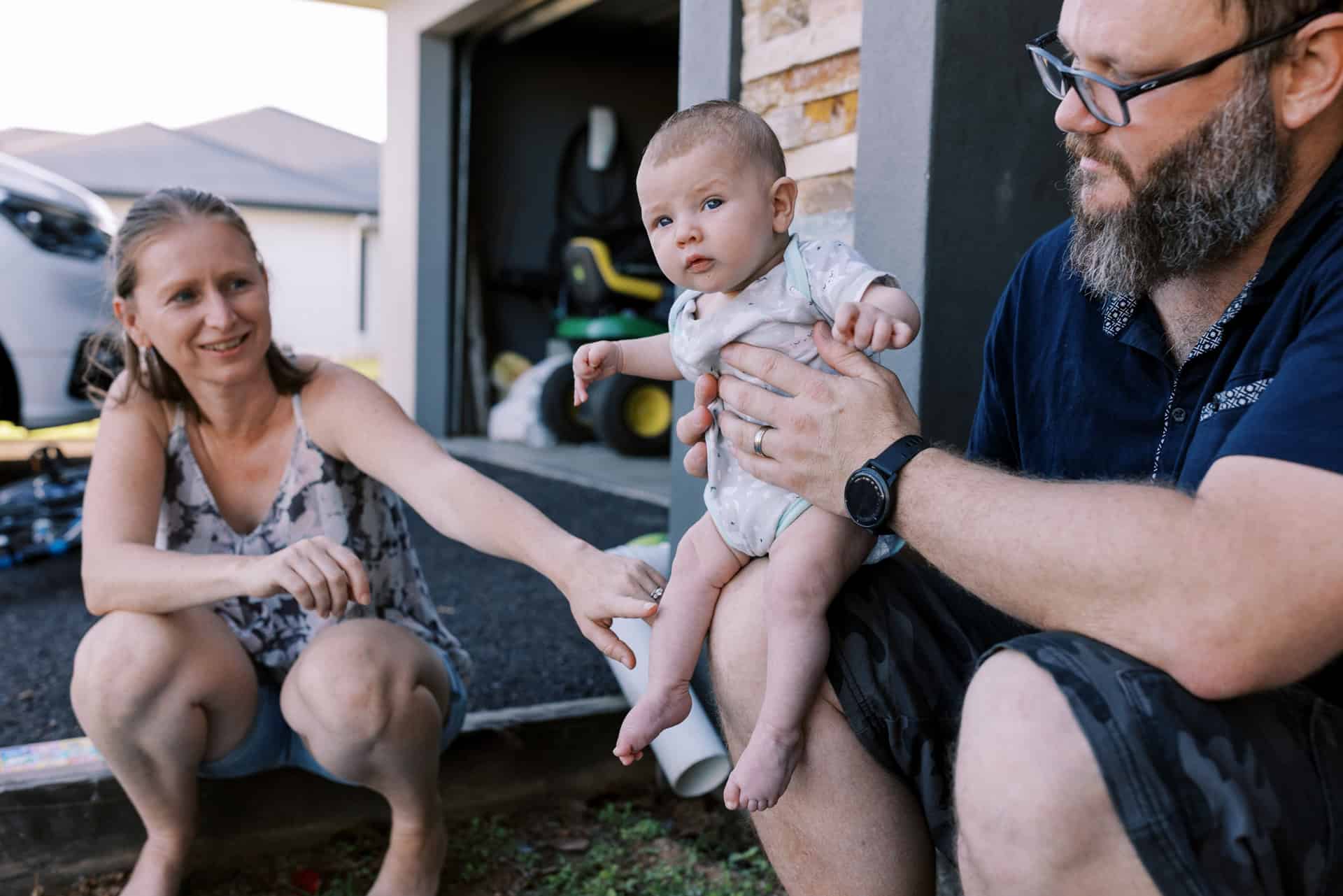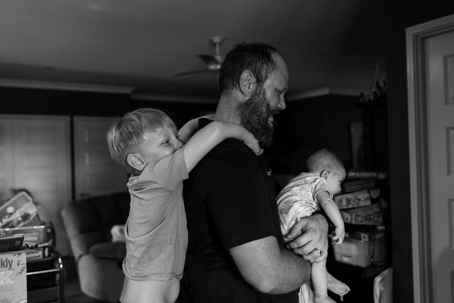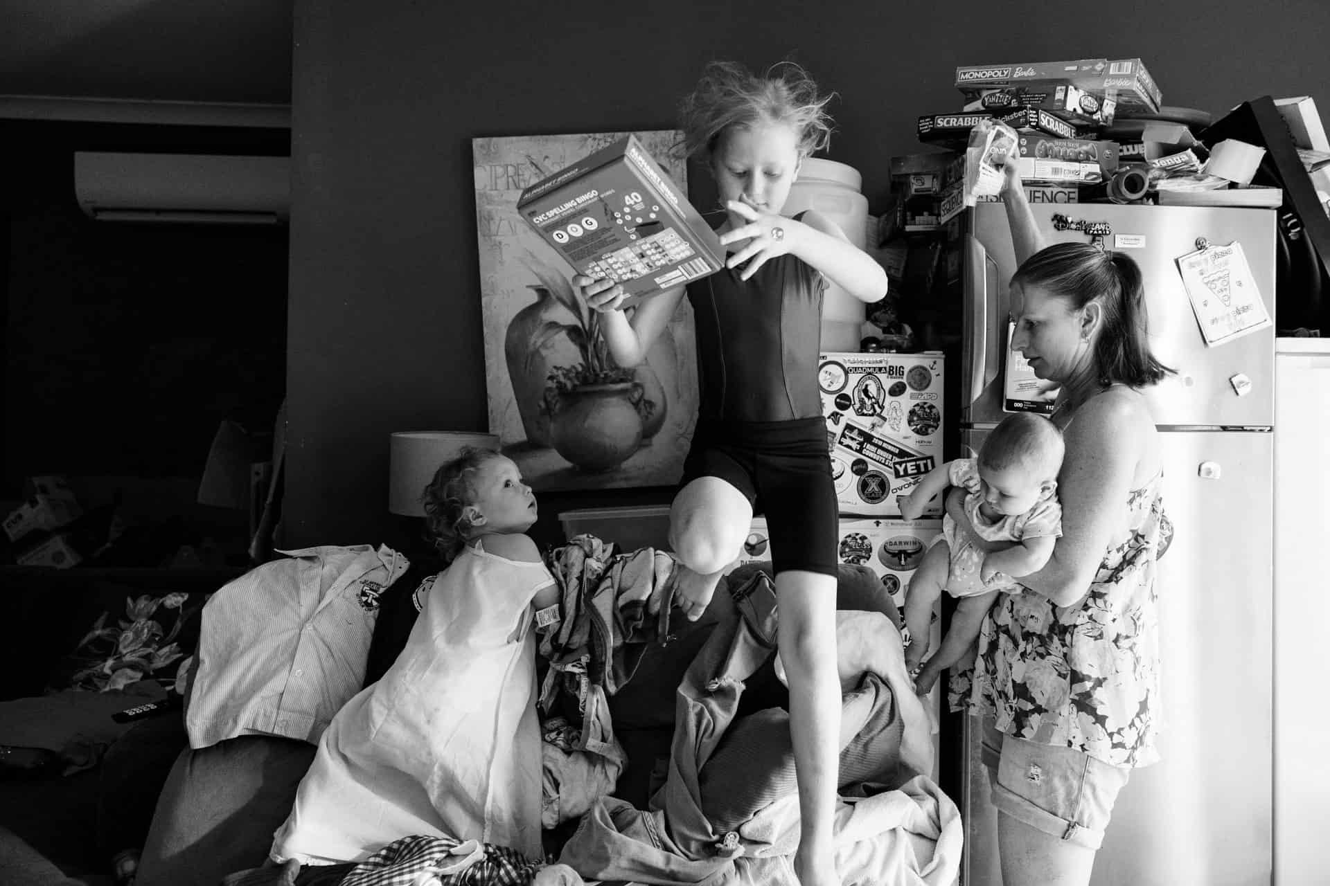 As soon as I arrived at their house to photograph their family of four (including their new baby), I could see that these parents totally delighted in their kids. The had made their home one they all loved to be in (and out in the yard too). From a rock wall being constructed in the entry to board games stack high on fridges. Behind the couch was a construction area…better than most preschools could provide! Their couches were not only for lying but also a valuable fort building resource. This family provided opportunity for unlimited play and adventure…everywhere. Their latest addition to the family fit in on one parents hips and in their arms. They all just “work” together.